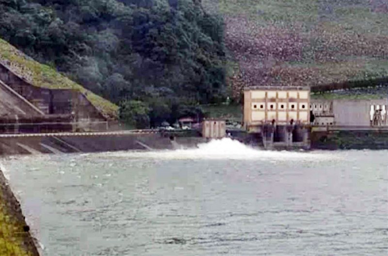卡努颱風來襲,桃園市石門水庫完成緊急應變,永久河道放水口調節放水中。圖/北水局提供