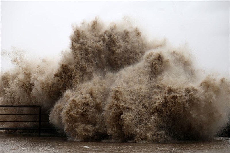 受颱風「卡努」影響,浙江溫嶺城南鎮東峰山文化禮堂附近海域,掀起巨浪。圖/取自澎湃新聞