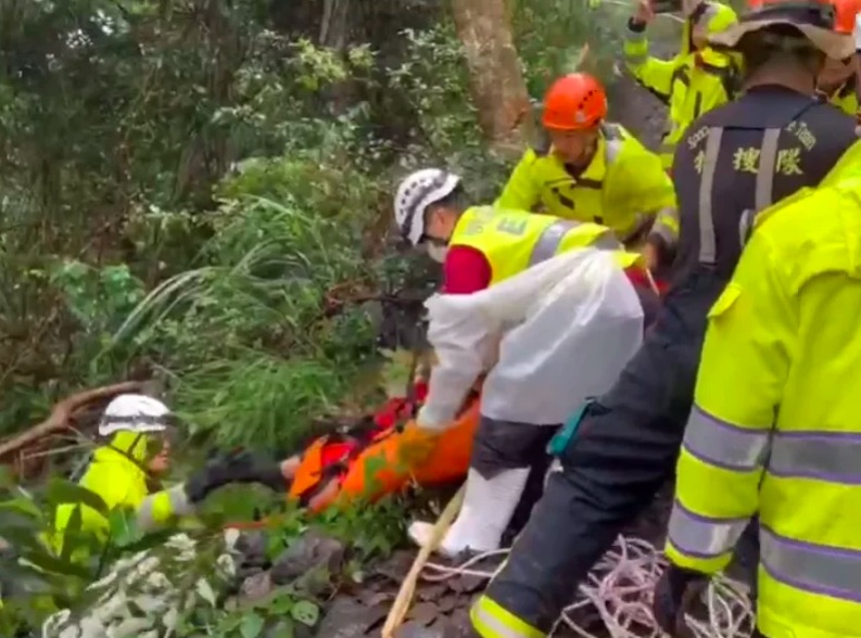 台電委外包商的工作車翻落復興區雪霧鬧部落山坡下,警消全力救人。圖/桃園市消防局提供