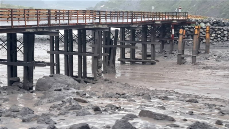 甲仙工務段表示,今(4)日上午5時30分左右,玉穗溪上游豪雨誘發邊坡崩塌,大規模土石流及多顆直徑6至8公尺以上巨石,導致台20線南橫公路明霸克露橋鋼便橋防撞樁沖毀流失,以及P3至P5立柱受損道路中斷。