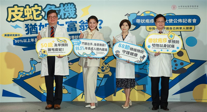 記者會合影。左起台灣家庭醫學醫學會理事長黃振國、衛教大使陳亞蘭、台大醫院家庭醫學部部主任程劭儀、恩主公醫院院長黃信彰,四人同台呼籲50歲以上與免疫力低下的高風險族群,應及早預防皮蛇。圖/記者陳玲芳