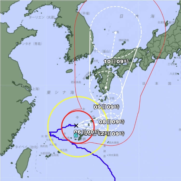 日本氣象廳觀測,卡努5日上午10時位於沖繩縣久米島北方約160公里海面上,緩慢朝東行進,沖繩本島全境在短期內二度被暴風圈籠罩。圖/取自日本氣象廳網頁data.jma.go.jp