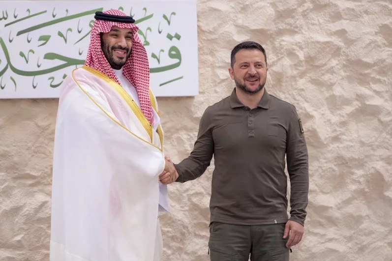 沙烏地阿拉伯吉達舉行的國際和平解決烏克蘭戰爭會談在5日第一天的會談結束後小有進展。圖為沙國王儲穆罕默德(左)今年5月在吉德會晤烏克蘭總統澤倫斯基。圖/美聯社