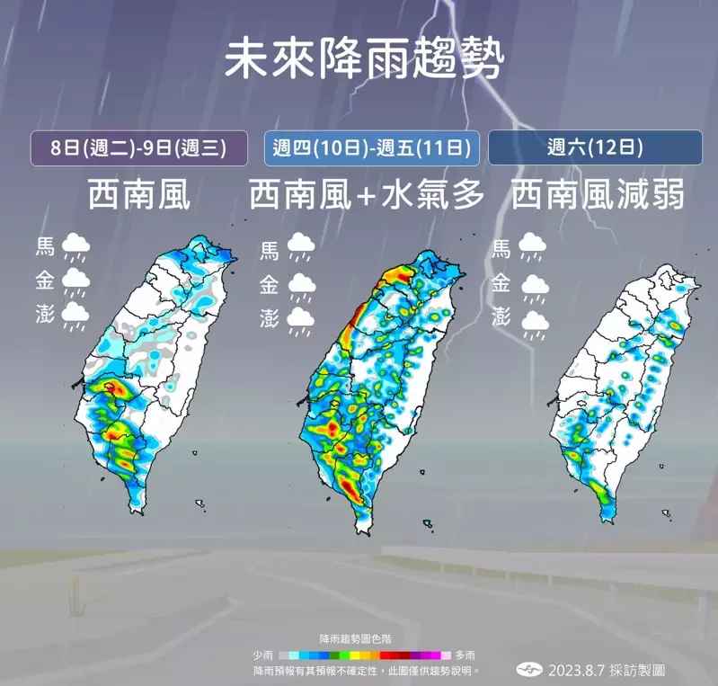 中央氣象局預報員曾昭誠指出,受西南風影響,周二至周三,中南部持續有短暫陣雨或雷雨;南部山區可能有豪雨等級降雨;北部明天降雨機率也提升,有局部短暫陣雨或雷雨,東半部則以午後雷陣雨為主。