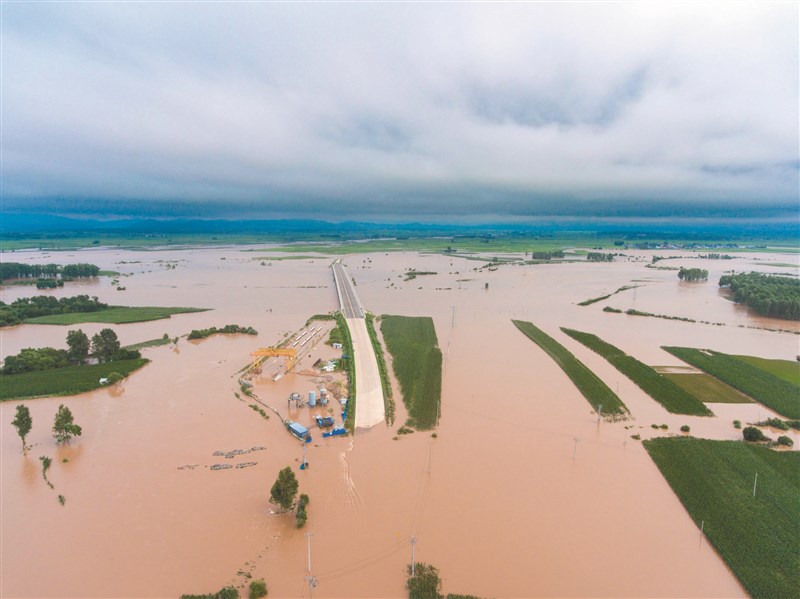 杜蘇芮颱風重創中國大陸多個產糧大省,圖為黑龍江省哈爾濱市延壽縣部分農田日前慘遭洪水淹沒的景象。圖/新華社