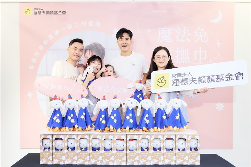 【記者陳玲芳台北報導】羅慧夫顱顏基金會今(8)日舉辦「魔法兔安撫巾」開賣記者會。唇裂與小耳症兩組顱顏家庭蒞臨現場,分享懷孕時的擔憂及孩子出生後心情上的轉折。女兒剛滿月的王傳一擔任愛心大使,邀請大家認購義賣品「魔法兔安撫巾」陪伴顱顏新手家庭不再孤單。