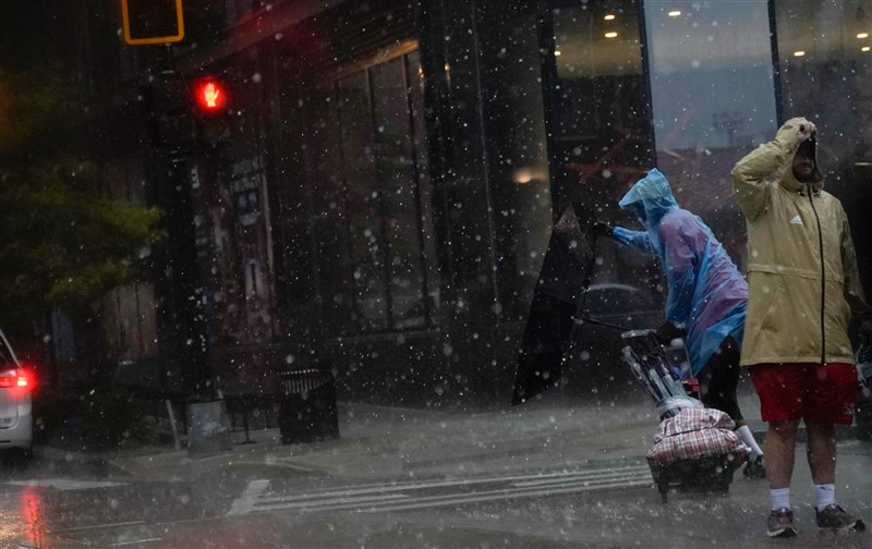 從阿拉巴馬州到紐約州,幾乎整個美東沿海地區都出現降雨、強風並下起冰雹。圖為華盛頓特區強風伴隨降雨吹翻路人雨傘。圖/法新社
