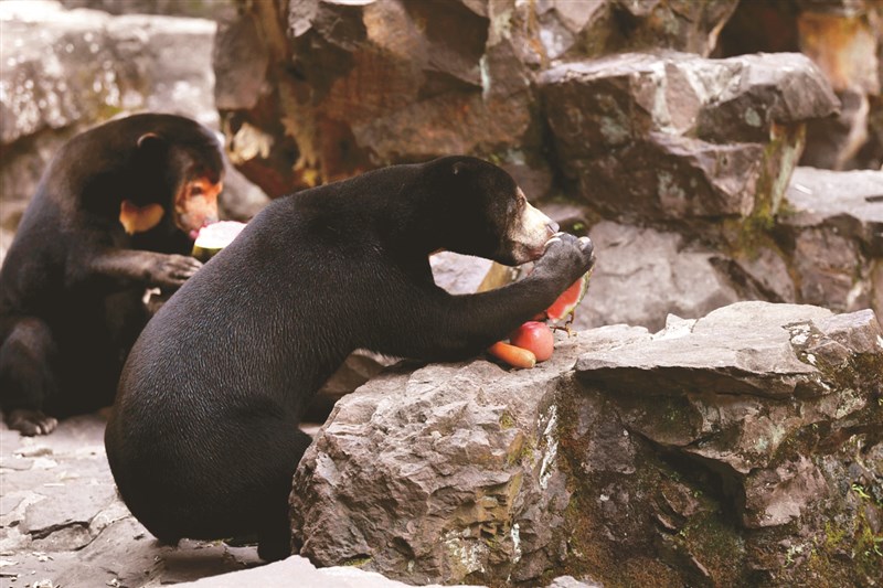 中國大陸官媒新華社,特別拍攝馬來熊在杭州動物園享用水果。圖/新華社
