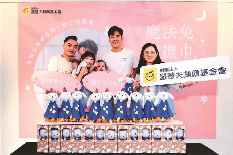 藝人王傳一(右2)擔任愛心大使,邀大家認購義賣品「魔法兔安撫巾」。圖/羅慧夫顱顏基金會提供