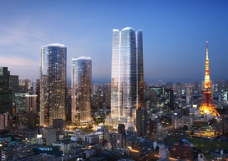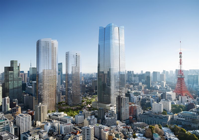 日本地產開發商森大廈公司8日為東京最高辦公大樓「麻布台之丘森JP塔」揭幕,集結商業設施和住宅。圖片中最高大樓為「麻布台之丘森JP塔」。圖/moriliving.com