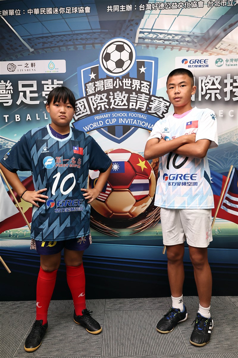 球員代表花蓮東里國小胡巧柔(左)及台中協和國小林子齊(右)。圖/迷你足球協會提供