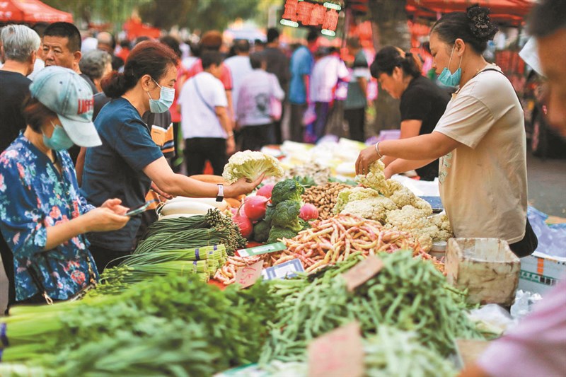 中國大陸7月消費者物價指數(CPI)從上月持平轉為年減0.3%,為2021年2月以來首次降至負值。圖為民眾9日在遼寧省瀋陽市一處市場買菜。圖/法新社