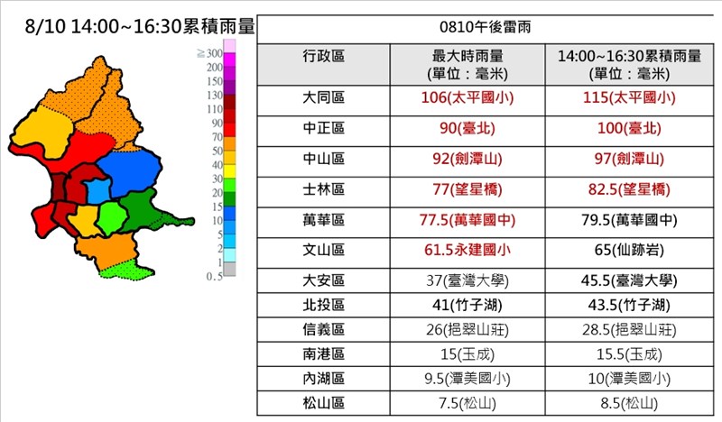 雨彈襲北市 災害應變中心強化三級開設 |2023.08.10 語音朗讀 691觀看次 字級 大 中 小 雨彈轟北市,最大時雨量破100毫米、水淹20公分。圖為中正區和平西路一段積水處。圖/北市消防局提供 【本報台北訊】北市府災防辦公室示警,依中央氣象局預報資料,今、明兩日因大氣環境適合午後對流發展,台北市午後出現短延時強降雨發生,最大時雨量在大同區,已達100毫米,中正區有地區水深15公分。因應今日強降雨,北市災害應變中心強化三級開設。北市災防辦公室指出,目前午後對流發展巔峰期已過,目前對流中心已逐漸向北北西移動,回波較大降雨區已逐漸北移至士林、北投區,最大雨勢預期將再持續30分鐘左右,之後將慢慢趨緩。最大時雨量在大同區達100毫米、中正區時雨量達90毫米、中山區時雨量達80毫米。部分地區出現積水,北市中正區和平西路一段一處現場淹水,面積達80平方公尺、水深15公分,無人員受困。雨彈轟北市,最大時雨量破100毫米、水淹20公分。圖為中正區和平西路一段積水處。圖/北市消防局提供 北市災害應變中心下午提升為強化三級強化開設,由工務局、消防局、警察局及環保局等單位即刻派員進駐,其他防救災單位則同步於內部成立緊急應變小組處理突發災情。截至下午4時30分,北市災害應變中心接獲60多件災情通報,多為道路局部積淹水。雨彈轟北市,最大時雨量破100毫米、水淹20公分。圖為中正區和平西路一段積水處。圖/北市消防局提供 北市災害防救辦公室表示,根據中央氣象局預報資料,今明兩日因大氣環境適合午後對流發展,評估台北市午後將有短延時強降雨發生的機會,因此今日上午即發布預警訊息,通知各防救災單位全面檢視各項防救災設施,密切注意最新氣象資訊,因應突發狀況。氣象局針對新北市、桃園市發布大雷雨即時訊息,持續時間至下午6時45分止;台北市、新北市發布大雷雨即時訊息,持續時間至下午5時30分止。因應0810強降雨,北市災害應變中心強化三級開設。圖/北市府提供 前一篇文章 中職/王柏融有意明年回歸! 雄鷹領隊證實 下一篇文章 中職/王柏融打不好 洪總點出心態問題、個性悶 熱門新聞 01【分數之外】看見另一種英文2026.04.0802租賃車業者違法攬客 觀光署:最高罰200萬元2026.04.0703清明豪雨 合歡溪出現新堰塞湖2026.04.0904杉林溪園區 紫藤花盛開2026.04.0805計程車掛牌費喊到35萬元 交部出手2026.04.0806火金姑故鄉 賞螢好去處2026.04.0907哥國動盪城 變身世界圖書之都2026.04.0808【練瑜伽品生活】英雄式二 英雄不能只看正面2026.04.0809美伊談判 45天停火協議2026.04.0710吃素也能大補「鐵」 開心果芝麻含量豐2026.04.08 訂閱電子報 台北市 天氣預報 台灣一週天氣預報 相關報導 大型建案強制裝光電 藍提案喊卡鄭:若執政 恢復兩岸故宮交流海軍新造浮塢下水 後勤能量提升鄭麗文抵北京 鄭習會今登場鄭謁中山陵 公開提中華民國鄭麗文會宋濤:兩岸非註定一戰