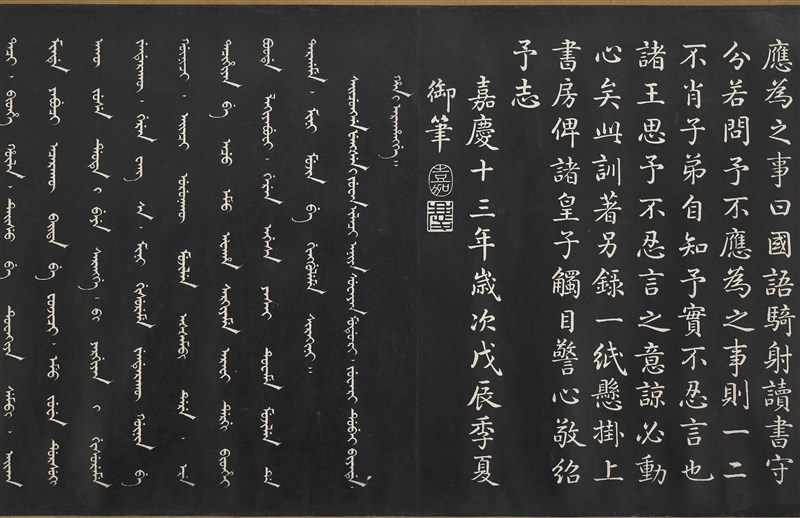 這次展出的《清嘉慶御製宗室訓》(圖)特別強調母語(滿語)及騎射的重要性,警惕皇子須維持「國語騎射」的滿洲民族特色。圖/故宮提供