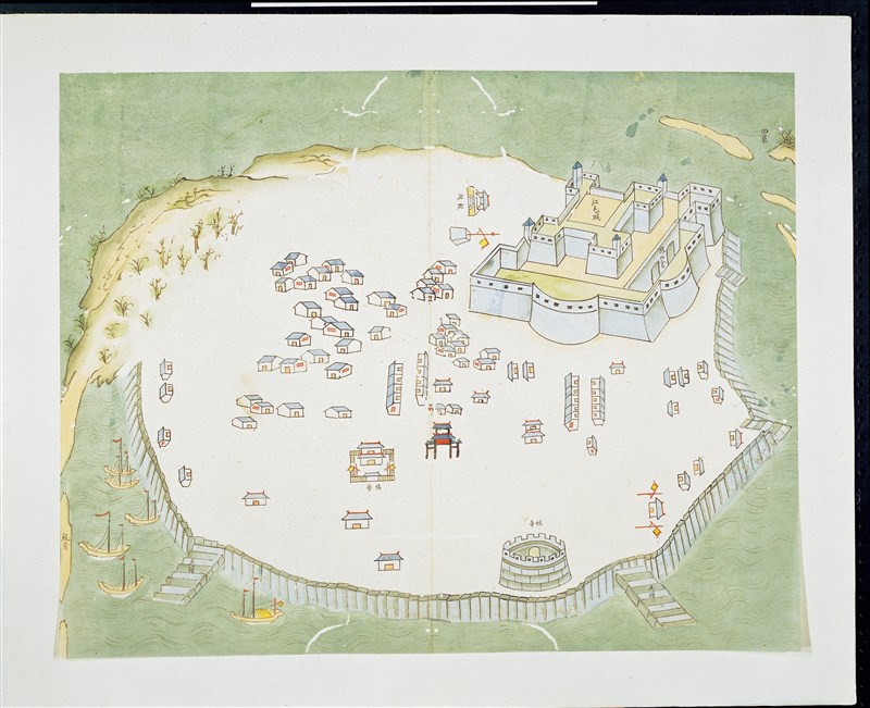 《重修台郡各建築圖說》呈現修築安平石岸、重修台郡天后宮(今台南大天后宮)、台灣府城隍廟之台灣歷史記憶,圖為修築安平石岸。圖/故宮提供 「院藏清代歷史文書珍品:阿哥養成記」8月12日至11月5日在故宮北部院區103陳列室展出;「院藏善本古籍選粹─彩繪圖籍」第1檔8月8日至11月12日、第2檔11月16日至明年2月18日於故宮北部院區104陳列室展出。