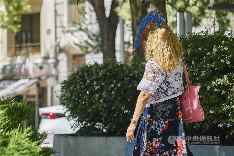 全球暖化日益嚴重,圖為西班牙街頭民眾拿扇子遮陽。圖/中央社