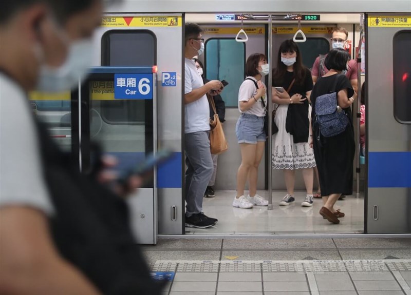 台北捷運12日表示,列車空調已設定為夏季模式,平日尖峰時間為攝氏23度。圖為民眾戴口罩搭乘台北捷運。圖/中央社