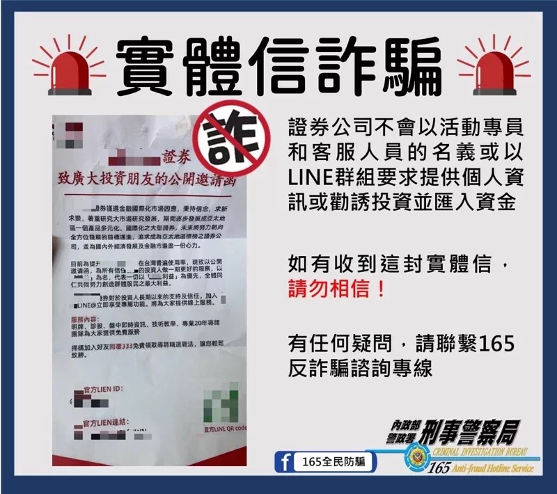 【本報台北訊】刑事警察局今天提醒,近日發現有詐欺集團寄發實體信件廣告,內容散布假投資詐欺訊息,以假冒證券公司,聲稱要「提升服務功能」、「輕鬆致勝」等話術,引誘民眾掃描信件內投資群組的QR CODE及LINE ID,誘騙到詐欺群組後行騙。