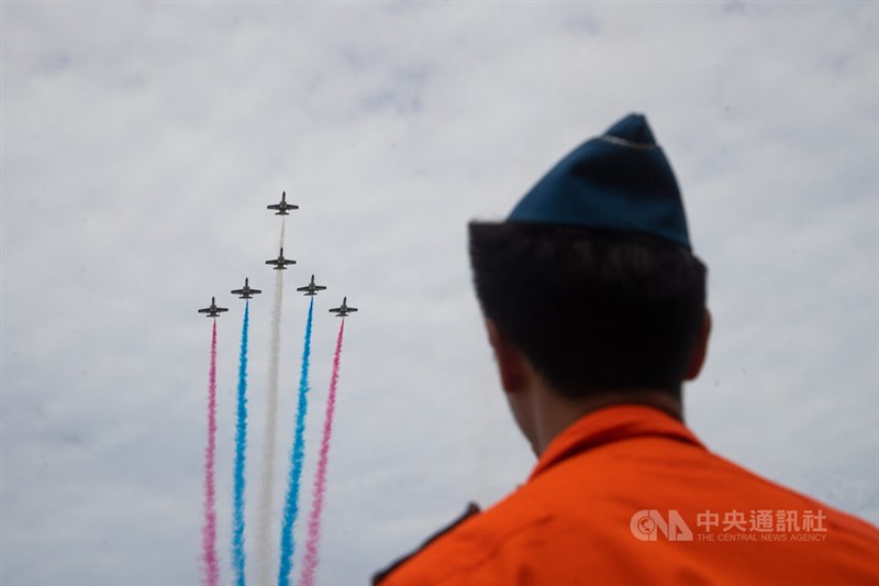 台中清泉崗空軍基地12日營區開放,雷虎特技小組大秀飛行技術。圖/中央社