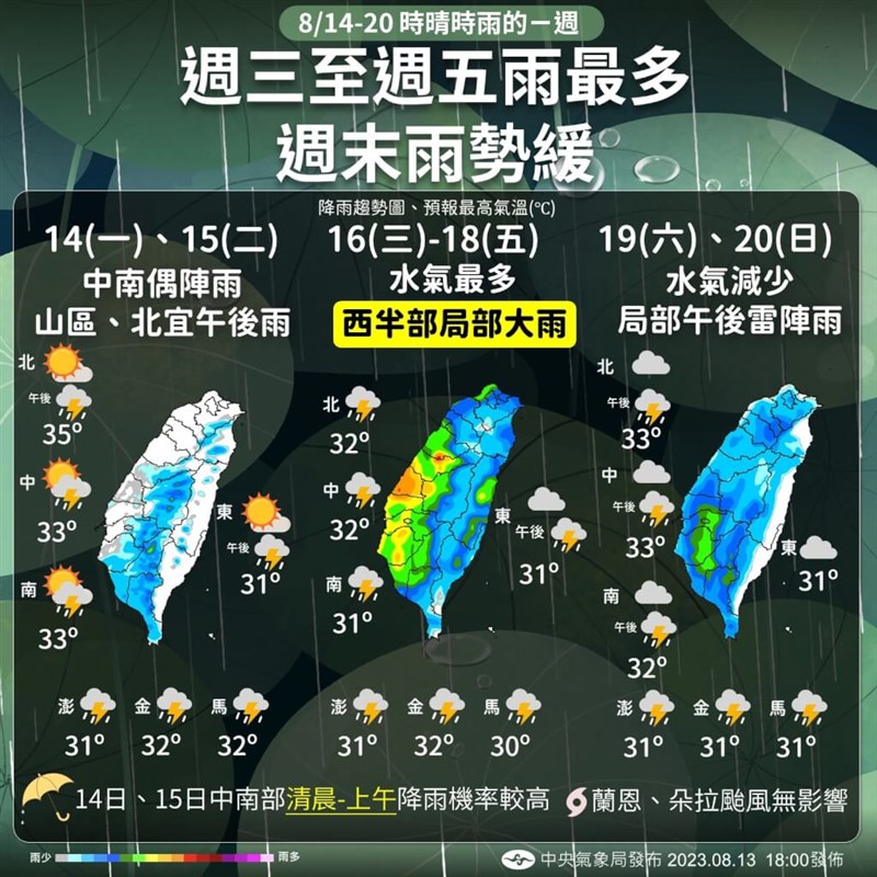 林定宜進一步說明,16日至18日水氣增多、西南風增強,西半部有局部短暫陣雨或雷雨,並有局部大雨發生的機會;19、20日西南風減弱,降雨再趨緩,主要是午後西半部地區及其他山區有局部短暫雷陣雨。