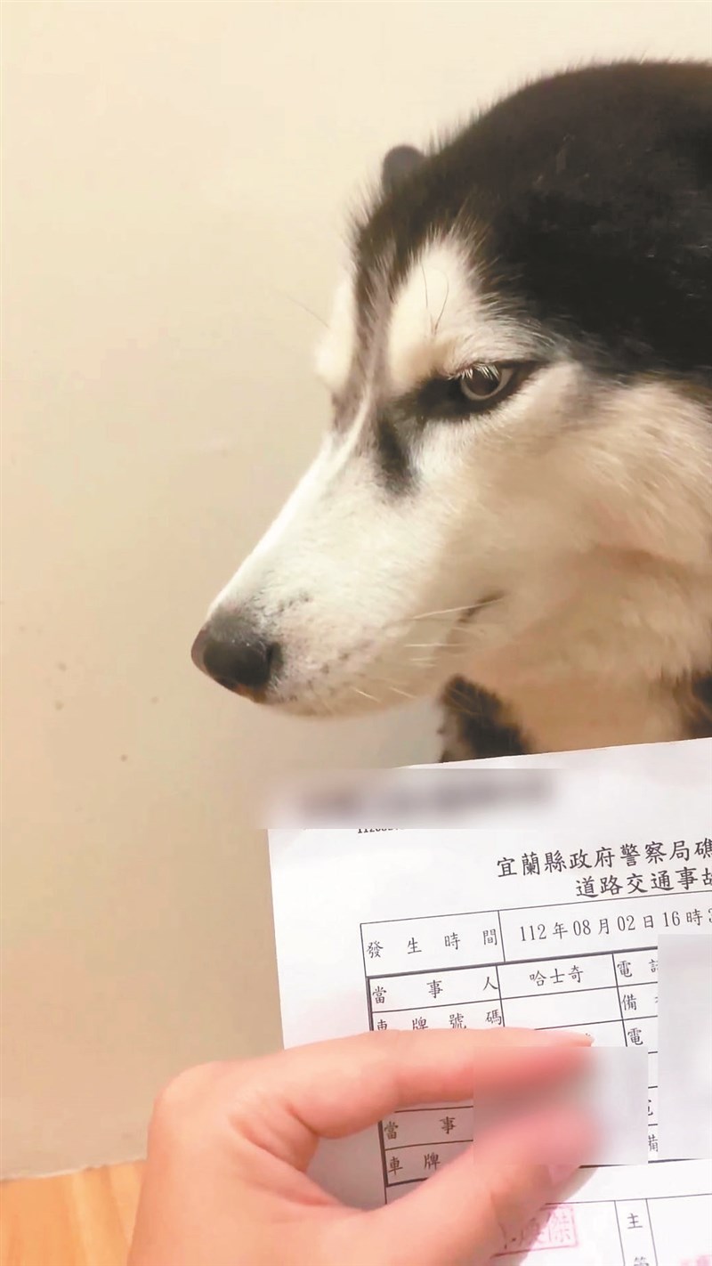 【本報宜蘭訊】宜蘭礁溪日前發生一起交通事故,事故單上「事主」欄位竟然填寫著「哈士奇」。原來是哈士奇跑到馬路中間,經過車輛嚇得急煞車,後方機車騎士閃避不及撞上汽車,無人受傷;飼主事後將事故聯單與哈士奇被罵厭世表情影片,發布上網,網友大喊「笑死」、「好奇筆錄怎麼做」。