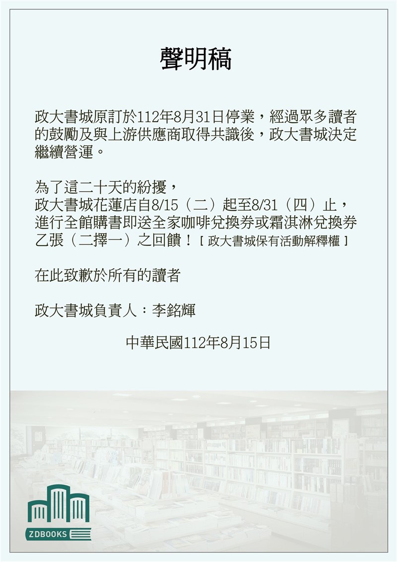 上月傳出政大書城花蓮店將於8月31日停業,令各界感到不捨,不過今天花蓮店在臉書公告,經過眾多讀者的鼓勵,也與上游供應商取得共識後,決定繼續營運。為了回饋給讀者,即日起到月底前,全館購書就送便利商店咖啡或霜淇淋兌換券。網友得知後開心地說「這是花東的福氣」。