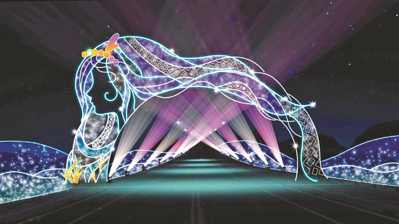 南方澳跨港大橋去年12月通車後將首度「封橋」;宜蘭縣政府定8月19至22日在此舉辦七夕情人節活動,大橋兩端引道布置〈噶瑪蘭公主〉與〈龜將軍〉裝置藝術門,把跨港大橋裝飾成「鵲橋」,讓遊客攜手上橋遠眺夜景,營造浪漫氛圍。圖為〈噶瑪蘭公主〉頭上髮飾,似蘭陽平原閃爍的綠珍珠。圖/宜蘭縣政府提供