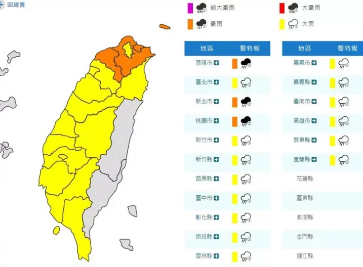 至於桃園市、新竹縣、新竹市有大雷雨,持續時間至13時15分;請慎防劇烈降雨、雷擊,溪(河)水暴漲,低窪地區慎防淹水。