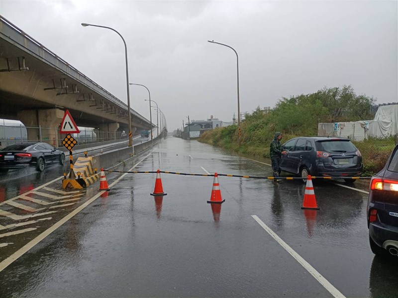 此外,觀音區台61線北上平面道路與忠孝路口出現嚴重積水,目前擺設交通連桿、交通錐管制,並有員警在場管制交通,目前無安全顧慮。