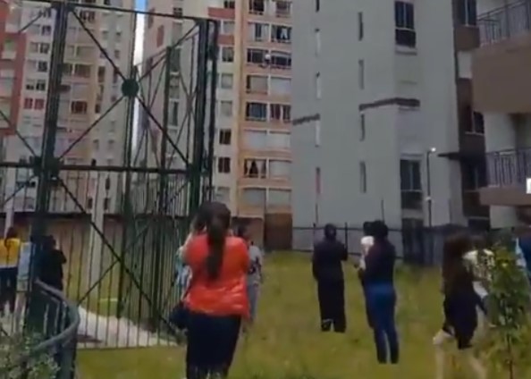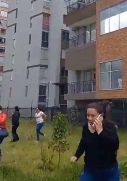 哥倫比亞首都波哥大發生規模6.1地震,民眾逃離公寓急忙打電話。圖/twitter@BryaanRivera1