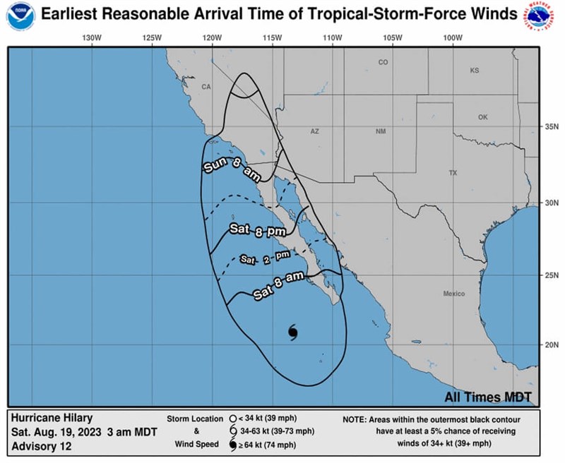 美國國家颶風中心則對從美墨邊界到加州文杜拉郡(Ventura County)慕古角(Point Mugu)的地區,以及卡塔利那島(Catalina Island),發布不尋常的熱帶風暴警戒。