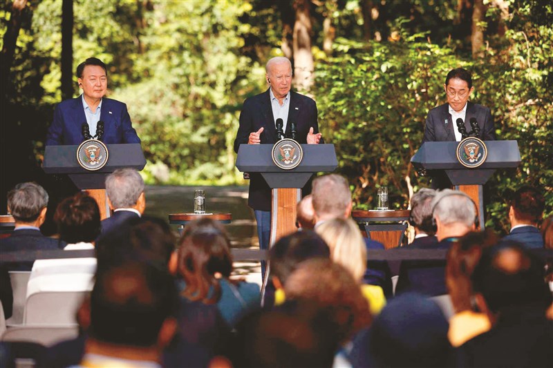 美國總統拜登(中)、日本首相岸田文雄(右)和南韓總統尹錫悅(左),18日在美國馬里蘭州大衛營舉行高峰會並發表聲明,強調有必要維持台灣和平穩定。