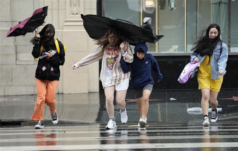 8月20日,受熱帶風暴希拉里影響,洛杉磯行人冒著風雨穿過好萊塢大道。圖/美聯社