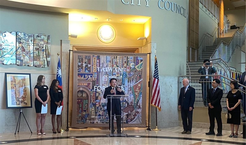 會場展示已故台灣膠彩畫大師郭雪湖的鉅作「南街殷賑」大型背版及復刻畫,駐丹佛辦事處長黃世昌透過作品的歷史背景,介紹台灣多元豐富包容的文化。