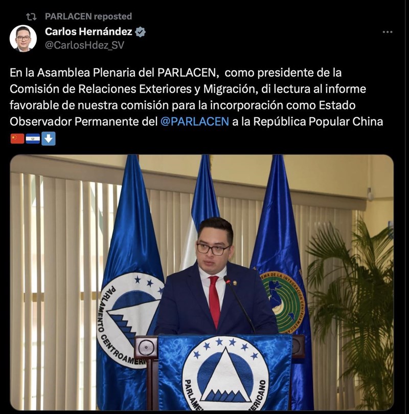 中美洲議會通過官方社交媒體帳號宣布,批准中國成為該機構常駐觀察員。圖/取自中美洲會議推特