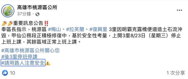 明霸克露橋便道又毀 高市桃源區3里停班停課 王淑芬 |2023.08.23 語音朗讀 5316觀看次 字級 大 中 小 搶修中的明霸克露橋便道又被土石流沖毀,高雄市桃源區公所宣布桃源區梅山、拉芙蘭、復興里3里23日停止上班上課。圖/取自桃源區公所 【記者王淑芬高雄報導】高雄市桃源區公所今(23日)上午7時20分許宣布桃源區梅山、拉芙蘭、復興里3里因為明霸克露橋便道被土石流沖毀,甲仙工務段正積極修復中,基於安全性考量,3里停止上班上課,其餘區域正常上班上課。公路總局第三區養護工程處於昨日晚上發布消息指出,玉穗溪爆發土石流下沖,將已清淤的沉砂池再次填滿,甚至比前次卡努颱風時淤積更高。圖/公路總局提供工務段現場保全人員全天候守視,已提前預警性封閉並管制人車通行,所幸無人、車損傷情況,且現場施工車輛及人員均已提前撤離安全無損,惟目前供居民通行的河床便道遭沖毀暫時無法通行,至於施工單位正積極修復中的鋼便橋則尚待土石流過後進一步調查評估受損情形。圖/公路總局提供甲仙工務段續辦後續搶災作業,由於土石流淹沒明霸克露橋河床涵管便道,已緊急道路封閉,暫時無法通行;後續將視鋼便橋及河床涵管便道實際受損情形再恢復可通行方式,交通管制期間如有造成不便,敬請見諒。工程單位建議用路人非必要避免進入山區道路,以確保自身安全。相關訊息請利用公路總局公路防救災資訊系統查詢路況。圖/取自桃源區公所 前一篇文章 【星雲大師如是說】善為屬下 下一篇文章 【星雲大師如是說】充電 熱門新聞 01台中新社花海 重現經典卡通2025.11.0602WTA、ATP年終賽 獎金創新高2025.11.0703大崗山淨山健走行三好 佛光人守護山林2025.11.0504法水寺送給天國的信 700天燈傳達想念祝福2025.11.0505佛光山中區三皈五戒 佛子安頓身心2025.11.0506星雲大師全集【傳記】百年佛緣─生活篇 我的衣食住行 5 - 32025.11.0507山本由伸 拚美職首座賽揚獎2025.11.0508【古堡麗影】倫敦塔:英國千年歷史活教材2025.11.0509古老金幣2025.11.0510佛光佈教師、友愛服務隊 精進行佛2025.11.06 訂閱電子報 台北市 天氣預報 台灣一週天氣預報 相關報導 【星雲大師如是說】處事禪心【星雲大師如是說】人間佛教【星雲大師如是說】正信之美【星雲大師如是說】輪轉相繼【星雲大師如是說】有情的層次【星雲大師如是說】六忍歌 作者其他文章學童當小農 種出玉米窗簾大崗山淨山健走行三好 佛光人守護山林佛光山書蔬展11月8日登場 好看好吃好玩一針一線60載 林全誠繡出神韻人生紫斑蝶越冬 現幽谷奇景墨光.流變 開創複合型水墨新風貌