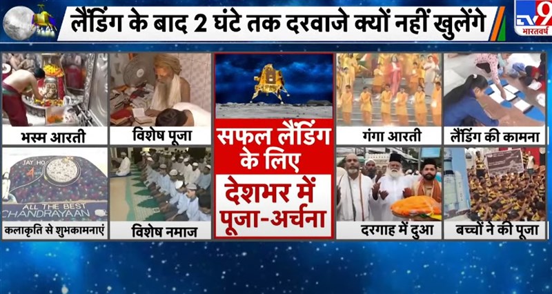 印度月球登陸器月球飛船3號預定23日傍晚「軟著陸」於月球南極,著陸過程可能費時30分鐘,全民關注祈禱中。圖/Youtube TV9 Bharatvarsh