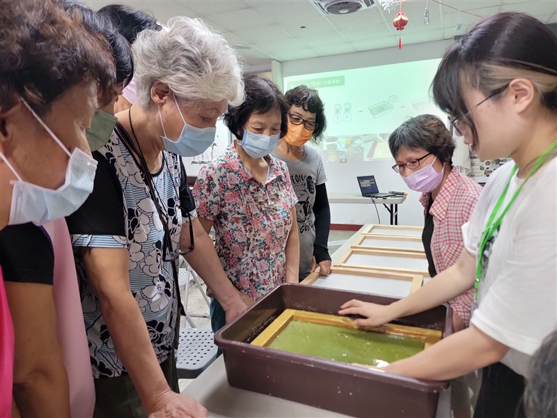 團隊帶著社區長輩將拔除裝袋的蔓澤蘭纖維,混合廢棄紙材,動手製作出可用來作為燈具用品材料的「韶光紙」。圖/台南市文化局提供