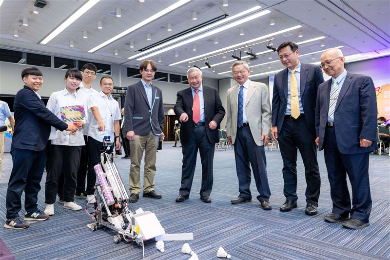 旺宏電子董事長吳敏求(右四)與評審團聆聽臺灣科技大學團隊介紹「羽毛球撿球與缺陷檢驗智慧訓練系統」作品。圖/主辦單位提供