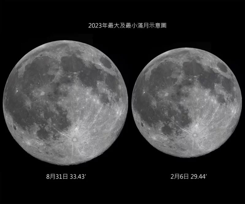 今年最大滿月距離地球只有35萬7341公里,視直徑33.43角分,比最小滿月29.44角分大了10%左右,容易看出差距。