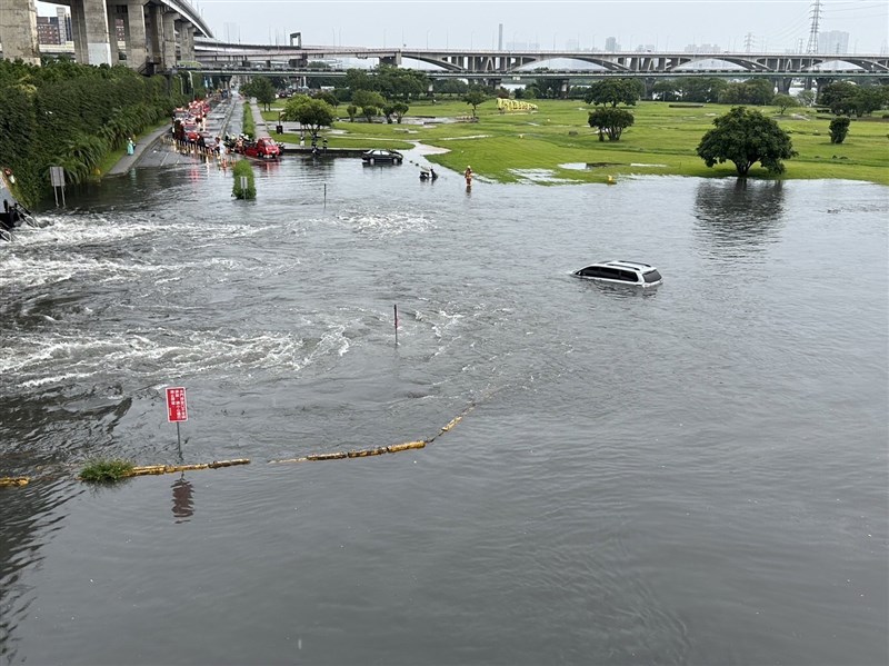 上周豪雨,華江橋堤外便道有民眾駕車闖入積水區,導致車輛拋錨。圖/新北海山分局提供