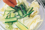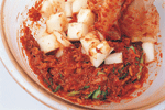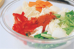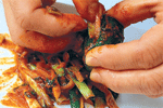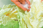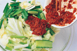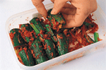 韓國泡菜 大變身 ◎葉智華 |2008.06.01 語音朗讀 1685觀看次 字級 大 中 小 泡菜不單單是一種神奇的醃漬物,用充分發酵過的泡菜來作炒菜、煮物、火鍋、煮麵、味噌湯等,只要是和加熱過後的料理一起搭配,都會變成一道不可思議、風味獨特的桌上佳肴。高緯度的韓國天氣嚴寒,缺乏新鮮蔬菜,所以就出現了醃製蔬菜的產物。泡菜不只是一種單純的保存食品,其實它也是一種高營養價值的蔬菜料理,每個季節都會做出各種不同風味泡菜。在春天,高麗人會告別冬天吃的泡菜,而等待鮮嫩蔬菜所製作的泡菜。在夏天,他們會製作清爽可口的帶葉蘿蔔泡菜,還有應時的清涼小黃瓜泡菜。接著到了秋天以後,他們會利用最後一批在露天栽培的蔬菜製作像蔥泡菜等類的泡菜。韓國的深秋來得比較早,所以在這時候,每個家庭都在忙著準備過冬的泡菜。一般過冬的泡菜分成三大種類,分別是白菜泡菜、蘿蔔泡菜和水漬泡菜(蘿蔔水漬泡菜)。在過去,四個人的家庭中所準備的白菜泡菜大約50kg左右,因為他們用心到連一年份及過冬用的泡菜都準備得相當齊全,就這樣度過了一個嚴寒的冬天。大白菜泡菜(kim-chi)材料:山東大白菜2棵約6斤、白蘿蔔300公克、胡蘿蔔150公克、大蒜150公克、薑50公克調味料:(1)鹽約2大匙(2)韓國辣椒粉2/3杯約50-60公克做法:1. 白菜不洗,由梗部切開一道裂口,再撕開成2半(圖1)(較大棵的可以再剖開一半)。2. 在每一層撒少許鹽(圖2),撒好之後放在大盆中,上面蓋上一個盤子(圖3),再壓上重的東西,使白菜中的水分滲出、變軟。3. 用冷開水將白菜沖洗一下,再倒扣在濾盆中,使水分滴乾。4. 辣椒粉放在碗中(圖4),將辣椒粉泡至8-9分濕潤。再拌入兩種蘿蔔絲,抓拌一下並加鹽調味。5. 把醬料倒至大盆中,白菜一片片的抹上醬料(圖5-6)。抹好後對折包捲整齊,放入盒中,再將剩餘的蘿蔔絲等倒在上面(圖7),蓋好盒蓋,放在室溫中。第二天打開聞一下,聞到透出酸味時,就可以移入冰箱中,再放1-2天以上即可食用。黃瓜泡菜材料:黃瓜10支、白蘿蔔絲100公克、胡蘿蔔100公克、薑30公克、炒過的白芝麻1大匙調味料:(1)鹽約1大匙(2)細的韓國辣椒粉2大匙、糖1大匙、鹽1茶匙做法:1. 黃瓜洗淨,整條抹鹽(圖1),至黃瓜回軟、能整支彎曲(約30-40分鐘)。2. 切成6-7公分長段,每段用尖刀在中間劃切十字刀口(圖2),上下兩端不斷,或一端斷、一端不斷。3. 白蘿蔔和胡蘿蔔分別切絲。辣椒粉放在碗中,再拌入兩種蘿蔔絲,抓拌一下,再加糖和鹽調味(圖3)。4. 加入白芝麻做成醬料。5. 將醬料塞入黃瓜縫中(圖4),再排放入盆中( 圖5),蓋上蓋子,醃至透便可食用。白蘿蔔泡菜材料:白蘿蔔1公斤醬料:薑30公克、梨或蘋果1/4個調味料:(1)鹽1大匙(2)細的韓國辣椒粉50公克、糖11/2大匙做法:1. 白蘿蔔切約1吋四方塊(圖1),放入大碗中。先撒約1大匙鹽拌勻,醃1小時,使蘿蔔出水。將水倒掉,沖洗一下,再瀝乾。2. 蘿蔔中加入辣椒粉、糖,再加醬料(圖3),抓拌一下使蘿蔔上色(圖4)。3. 拌勻的蘿蔔放入大罐子或保鮮盒中( 圖5),在上面壓一個較重的盤子,過1-2天,聞到味道出來時,移放入冰箱中,再過1天,醃透了即可食用。帶汁的泡菜材料:山東白菜1/2棵(約1斤)、白蘿蔔半個(約250公克)、胡蘿蔔100公克、紅辣椒2支、芹菜1支、細蔥3支、薑20公克、大蒜30公克、松子1大匙(可不加)調味料:(1)鹽適量、細韓國辣椒粉1大匙(2)太白粉1大匙、糖1大匙做法:1. 白菜切成約4公分的寬段,放在大碗中。白蘿蔔切3公分大小的厚片、胡蘿蔔切較薄的片,也放入大碗中( 圖1)均撒上適量鹽,拌醃至略出水、回軟。2. 紅辣椒切斜片或條狀;芹菜約3公分段;薑切片(圖2)。3. 鍋中煮滾5杯水。太白粉和糖用3大匙水調融化後,倒入滾水中,再煮滾後關火,放至涼。4. 全部材料放在大碗中,加入辣椒粉(圖3),用手輕輕抓拌一下(圖3)。5. 倒入放涼的太白粉水(圖4),再加入松子,倒入瓶中,蓋好。放入冰箱中,2-3天後可吃,可放約1星期。高麗菜泡菜材料:高麗菜1公斤、黃瓜5支醬料:薑10公克、梨或蘋果50公克調味料:鹽適量、韓國辣椒粉3大匙、糖2大匙做法:1. 高麗菜剖開,切除硬梗部分,再切成5公分大小塊狀;黃瓜先切成4公分長段,再切成厚片(圖1)。2. 兩種材料一起放在大碗中,加適量的鹽(圖2),拌醃約1小時,至菜回軟。用冷開水漂洗一下,瀝乾水分,放入大碗中。3. 醬料中的材料一起搗成泥狀,放入一個碗中,拌入辣椒粉和糖( 圖3)。4. 將醬料倒入高麗菜上(圖4),拌勻後放入保鮮盒或密閉的容器中,約1天後可食用。 前一篇文章 《美食小耳朵》黎巴嫩玫瑰蔬食館 下一篇文章 《本週推藨》棉花田生機園地 熱門新聞 01伊朗示威恐2萬死 川普:援助在路上2026.01.1502瑕疵品反爆紅 哭哭馬賣到缺貨2026.01.1403南亞偏鄉師參學新馬寺 交流創意教學法 2026.01.1404平價版人類洗澡機 預計年底開賣2026.01.1405日電鐵貴志站 任命第3代貓站長2026.01.1406重慶川普紅不讓 談旅遊給人歡喜2026.01.1407和韻新語國樂音樂會 佛館登場2026.01.1408星雲大師全集【傳記】百年佛緣─社緣篇 與佛菩薩感應記 4-22026.01.1409【我行遲遲】零下十四度的盛世2026.01.1410台美關稅 可望降至15%2026.01.14 訂閱電子報 台北市 天氣預報 台灣一週天氣預報 相關報導 【心經食譜】行深般若波羅蜜多時三品行【蔬活日常】暖呼呼的小碴子玉米粥【植感滋味】秋葵番茄天貝 健康又養胃【節氣養生】大寒 醋梅金棗醬 一匙酸甜溫潤寒冬【蔬活日常】涼拌菜其實不
