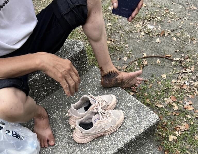 民眾假日到旗津海水浴場戲水,昨天有戲水民眾手腳沾滿油汙,照片在網路上流傳,民眾抱怨油漬難以清洗,猛力刷到破皮,導致旗津今天的遊客已明顯減少。