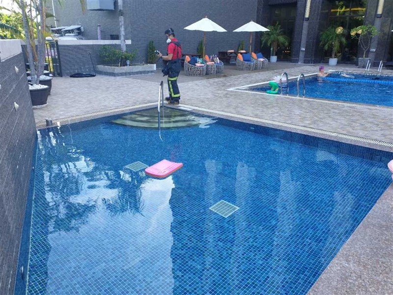 飯店曾姓協理說明,游泳池是採用自動加氯的濾淨系統,機器會自動判別加氯。