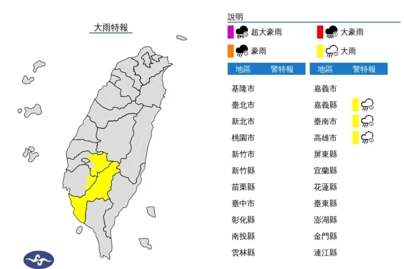 台南等4縣市晚間發布大雨特報 注意雷擊強陣風 |2023.08.28 語音朗讀 827觀看次 字級 大 中 小 中央氣象局今天晚間發布大雨特報,對流雲系發展旺盛,易有短延時強降雨。 圖/取自氣象局 【本報台北訊】中央氣象局今天晚間發布大雨特報,對流雲系發展旺盛,易有短延時強降雨,今天台北、嘉義、台南山區及高雄地區有局部大雨發生的機率,注意雷擊及強陣風。大雨地區為台北市、嘉義縣、台南市、高雄市。 前一篇文章 颱風蘇拉逼近 氣象局深夜11時30分發海警 下一篇文章 衡陽路4連棟 升格台北市定古蹟 熱門新聞 01台中新社花海 重現經典卡通2025.11.0602WTA、ATP年終賽 獎金創新高2025.11.0703大崗山淨山健走行三好 佛光人守護山林2025.11.0504法水寺送給天國的信 700天燈傳達想念祝福2025.11.0505佛光山中區三皈五戒 佛子安頓身心2025.11.0506星雲大師全集【傳記】百年佛緣─生活篇 我的衣食住行 5 - 32025.11.0507山本由伸 拚美職首座賽揚獎2025.11.0508【古堡麗影】倫敦塔:英國千年歷史活教材2025.11.0509【快樂塗鴉簿】夢境旅遊2025.11.0510古老金幣2025.11.05 訂閱電子報 台北市 天氣預報 台灣一週天氣預報 相關報導 巨型蔬果牆 行銷中台灣鳳凰撲台 今明北東雨量恐紫爆 西拉雅部落學校 傳承文化佛光山書蔬展開幕 聚焦天天行三好鳳凰將轉中颱 下周二雨勢最大佛光山大學校長論壇 盼教育融入佛法