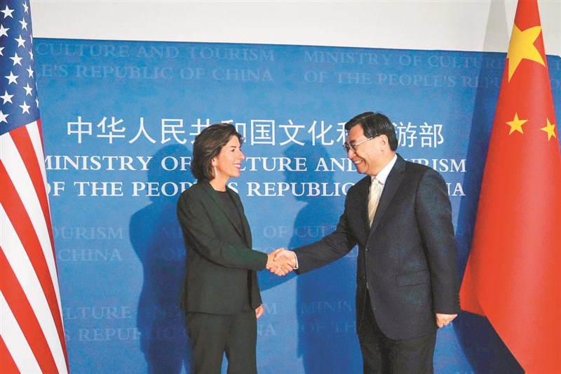 美國商務部長雷蒙朵(左)昨在北京與大陸文化和旅遊部長胡和平(右)會面。雙方同意於明年上半年,在大陸舉辦第14屆中美旅遊領袖峰會。圖/法新社