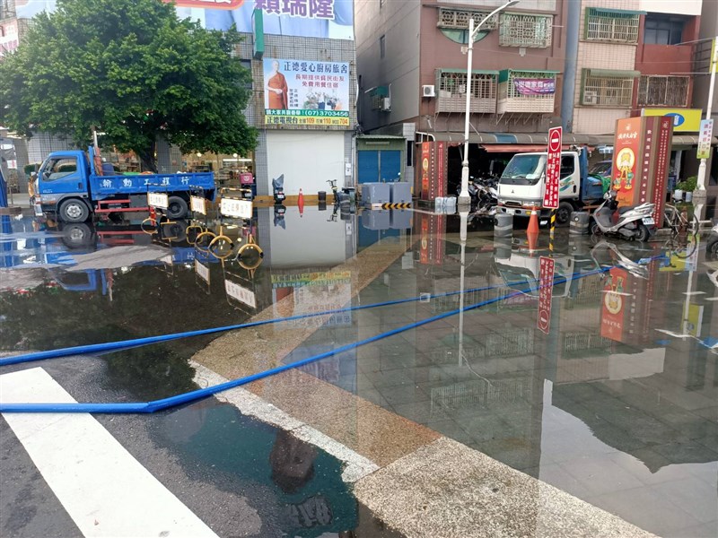 市府水利局上午出動5台抽水機在大關路及廟前路抽水,積淹水大約在9時30分時才消退。