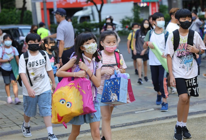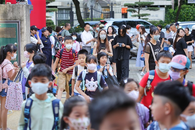 中小學30日開學,台北市仁愛國小仍有許多學生戴著口罩進入校園。圖/中央社