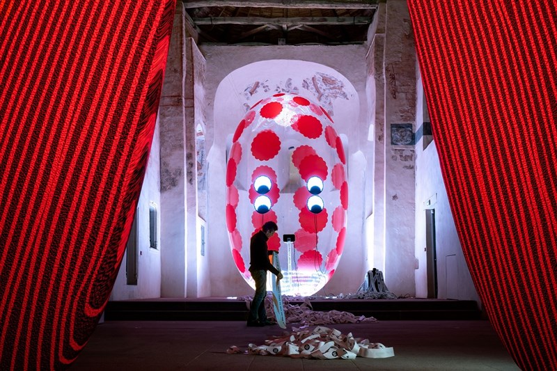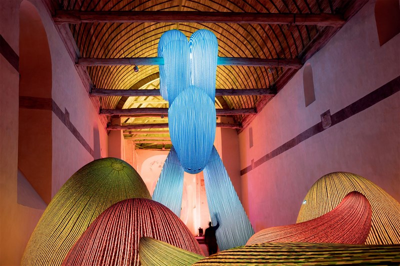 誠品生活新店開幕首展,邀澳洲團隊ENESS打造《AI靈感大師:澳洲3D光影觸動樂園》,而法國展出的原角色「瑜伽士」,將進化升級為台灣獨家角色—10公尺高的倒立「森之舞者」。圖為法國展出照片。圖/誠品生活提供