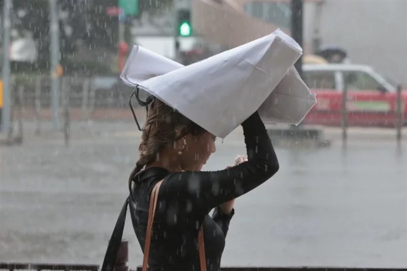 蘇拉颱風靠近香港帶來強降雨,市民在大雨中出行。圖/香港中通社